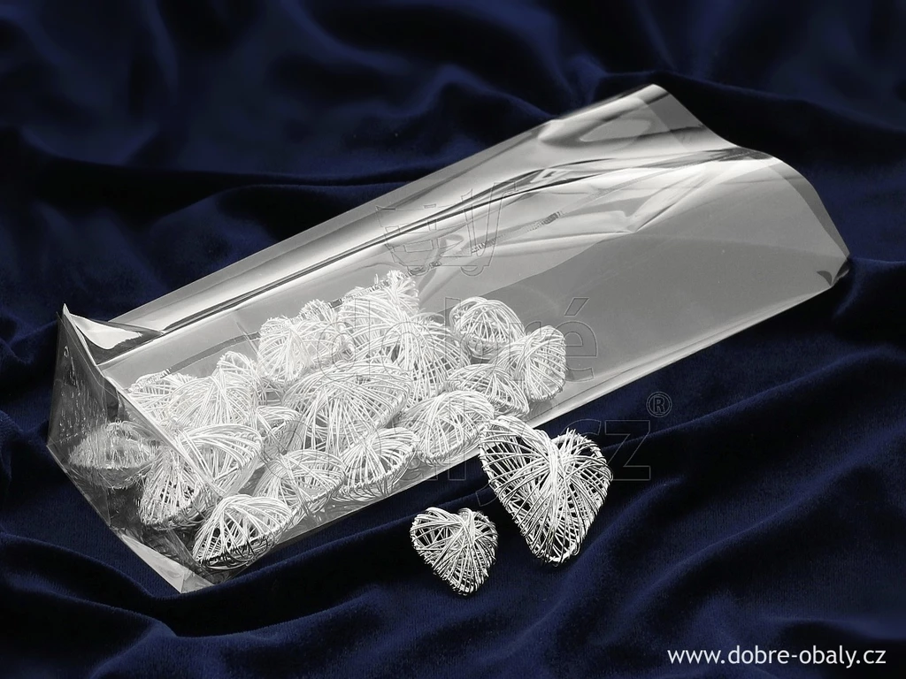 Kvalitní celofánový sáček vyrobený ze zcela transparentní fólie. Sáček nemá boční záložku, lepené vyztužené dno, spodní křížová záložka má hloubku 6,5 cm. Rozměry: šířka 16 cm, výška 27 cm. Materiál: BOPP fólie, obchodní název Tatrafán. Fólie je určená pro přímý styk s potravinami a je zdravotně nezávadná.