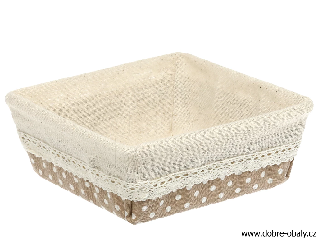 Malý dekorační košík s elegantní krajkou. Košík můžete využít pro originální dárkové balíčky, ale také na suché vazby a dekorace. Rozměry: dno 130 x 130 cm, horní část 160 x 160 cm, výška 65 mm.