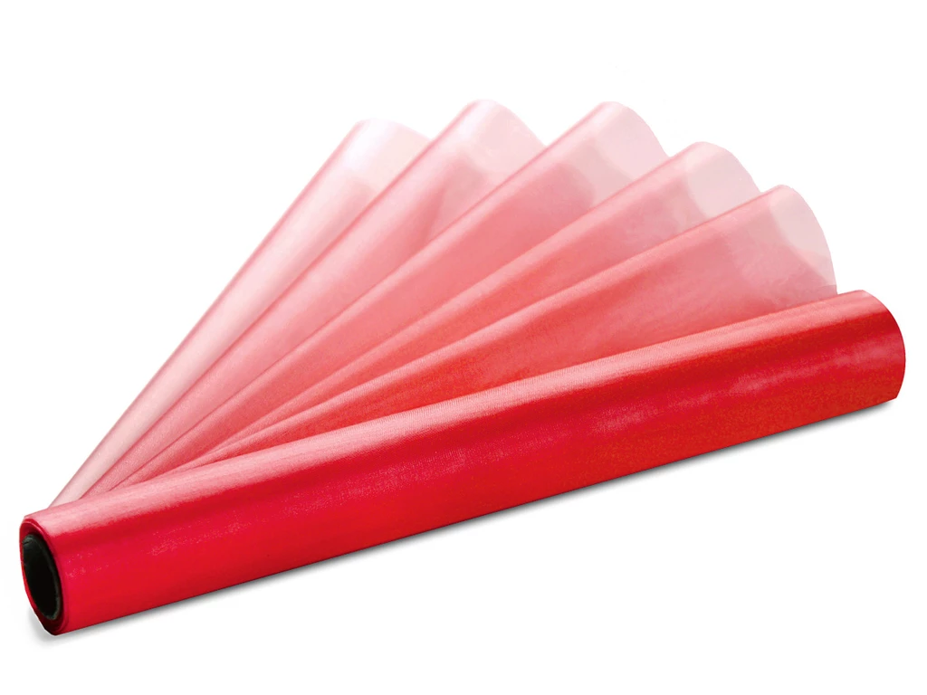 Dekorační měkčená textilie z tylu v atraktivní červené barvě, hustě tkaná vlákna vytvářejí hladký povrch s odlesky. Organza je poddajná a dá se všemožně mačkat aniž by ztratila svůj tvar, neobšitá, netřepí se na krajích.