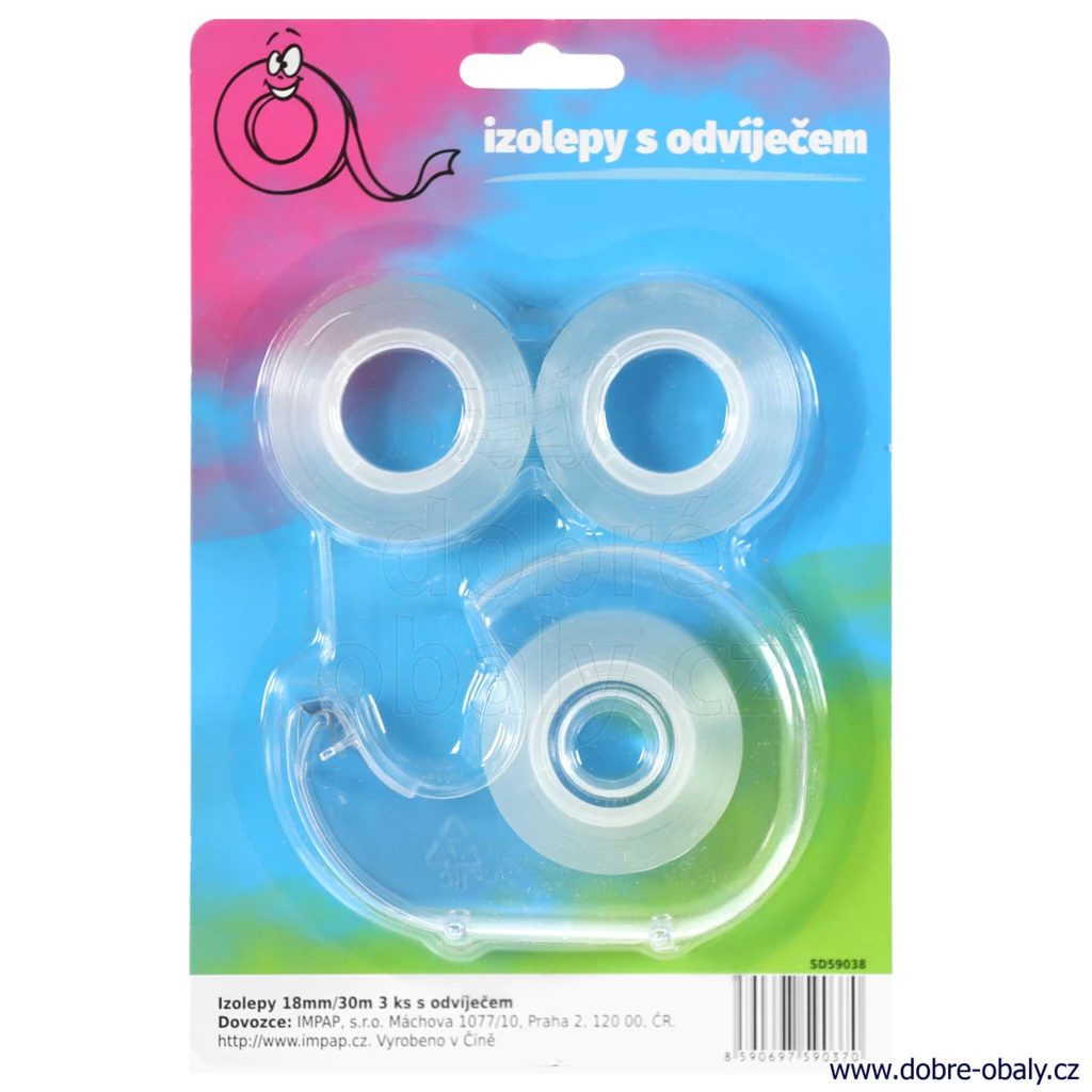Praktické balení odvíječe a standardních polypropylenových lepicích pásek s akrylátovým lepidlem. Balení obsahuje 1 ks transparentního odvíječe a 3 ks čirých lepicích pásek. Rozměry odvíječe: délka 100 mm, výška 75 mm, hloubka 22 mm. Rozměry pásky: šířka 18 mm, návin 30 m.