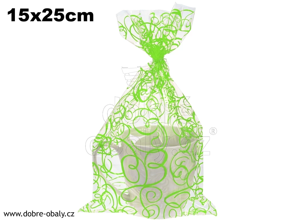 Kvalitní celofánový dárkový sáček s elegantním světle zeleným potiskem. Sáček má svařované dno a strany (nemá boční ani spodní záložky). Rozměry: šířka 15 cm, výška 25 cm, síla fólie 30 mikronů. Materiál: BOPP fólie - fólie je určená pro přímý styk s potravinami a je zdravotně nezávadná.
